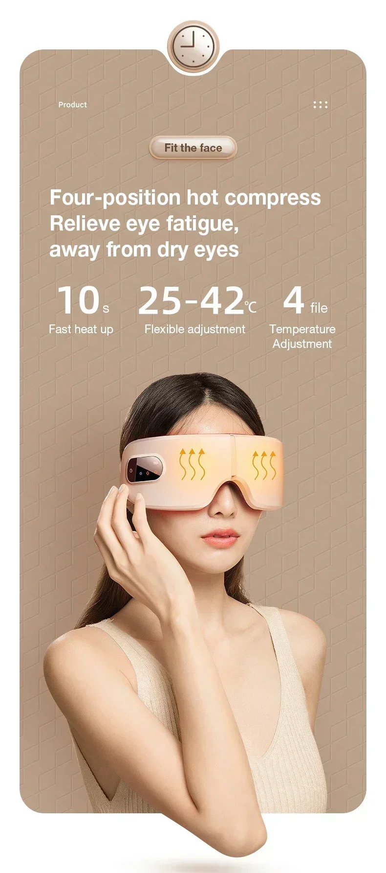 Featuring 16D airbag vibration, adjustable heat compress (25–42°C), and Bluetooth music, it soothes tired eyes, promotes better sleep, and helps relieve stress after long hours of screen use or work.